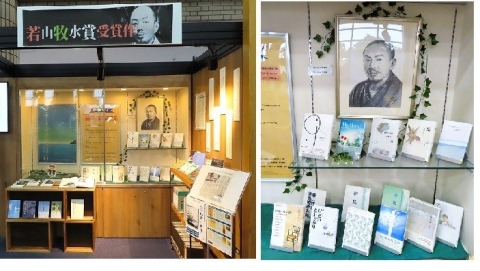 牧水生誕140年の節目の年である今回は、これまでの受賞作と牧水関連の図書などを展示しています。どうぞご覧ください。