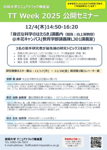 テニュアトラック推進室所属の若手研究者3名の研究概要ポスターを展示しています。